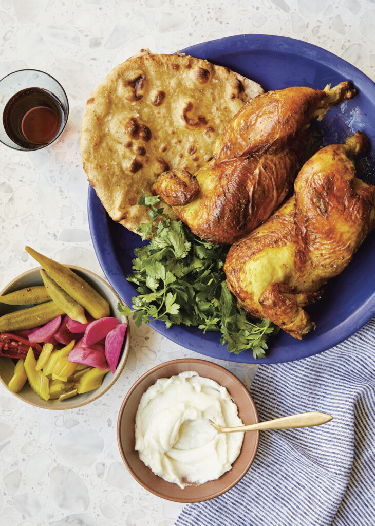 When my daughter, Saffron, turned two, we invited a bunch of people to our house for a dinner party. I decided to make this yogurt-marinated chicken, and it was easily the juiciest chicken I’d ever had in my life. The yogurt marinade acts like a brine, tenderizing the meat and making it even juicier than a normal roasted chicken. While the meat cooks, the marinade forms a hard shell around the bird that prevents any juices from escaping, steaming the chicken from the inside out and keeping it super moist. The delicate floral spices of fennel seed, coriander, orange peel, and orange blossom taste incredible on the extra-crispy skin.