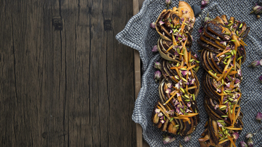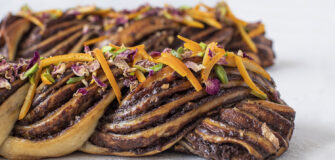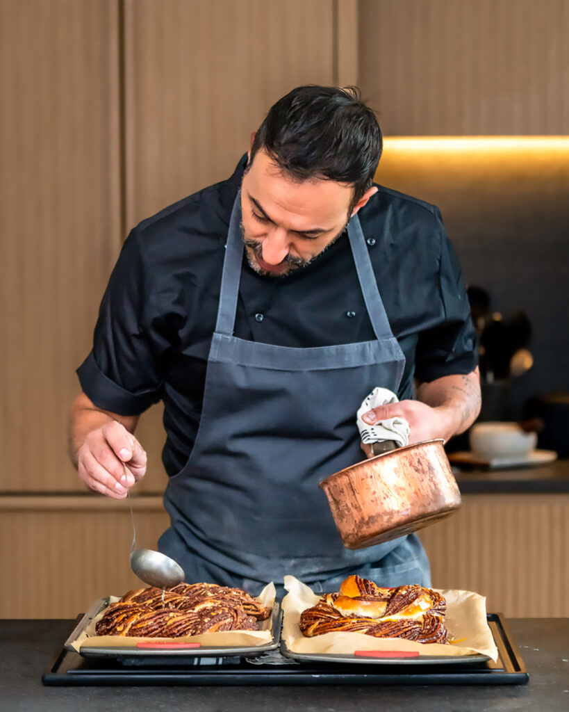 One day, he became intrigued when he saw his cousin’s family’s nanny making babka. “I really fell in love with the aesthetics of it,” he confides. “I said, ‘I want to try it,’ and she gave me the recipe.”