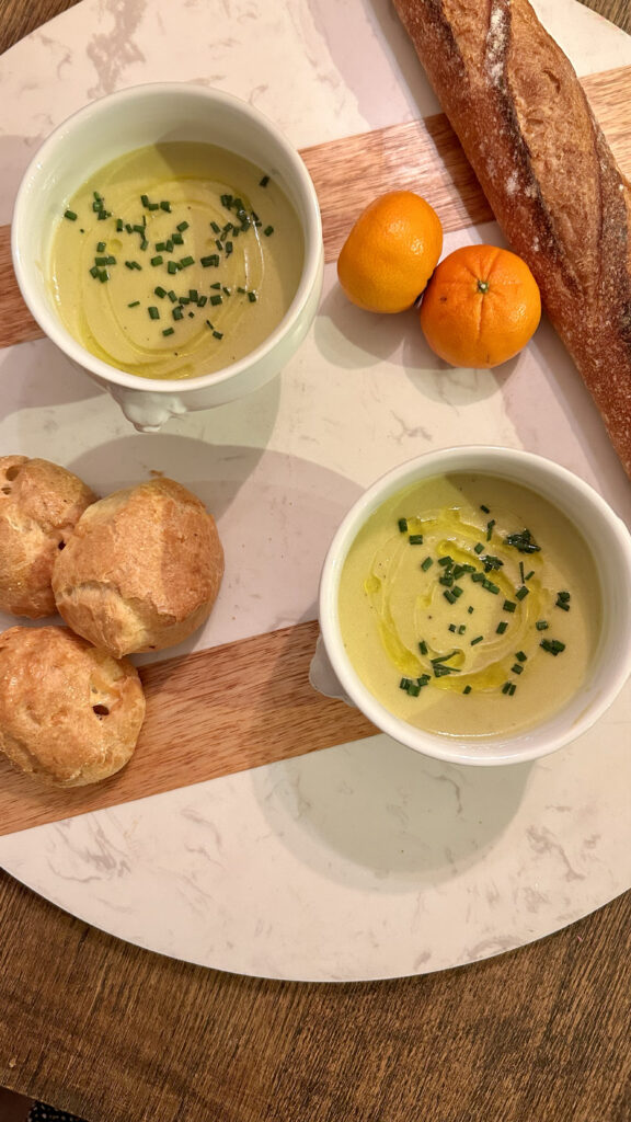 When done simmering, transfer leeks to a blender (if your blender is small do this in batches). Be very mindful that when you blend the hot soup, cover the top of the lid with a kitchen towel and press down so as not to have the lid pop off. The soup is hot and this can turn into a 3rd degree burn if you’re not careful.