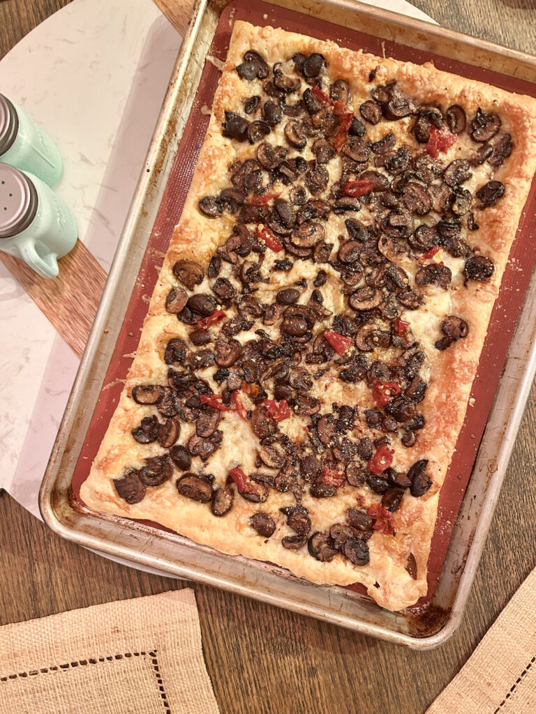 This is a French-style pizza made with Puff Pastry. I buy my puff pastry from the Persian Markets. They can be found in the frozen section, near the veggies. Unlike the American versions of puff pastry, the European and Middle Eastern kind is found rolled. I find them to be slightly butterier and longer. Traditional Pissalaldière is made with gruyère, stewed tomatoes, kalamata olives and anchovies. In this version, I’m using crimini mushrooms, shallots and gruyère. Splashing the sauteed mushrooms at the end with some fine sherry adds that umami depth of flavor that’s so je n’ais quoi!