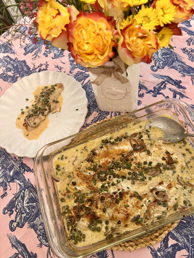 Roasted White Fish in a Mustard Caper Cream Sauce